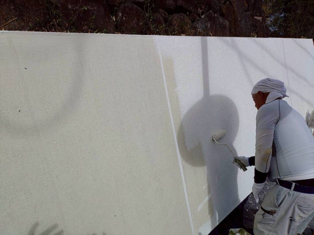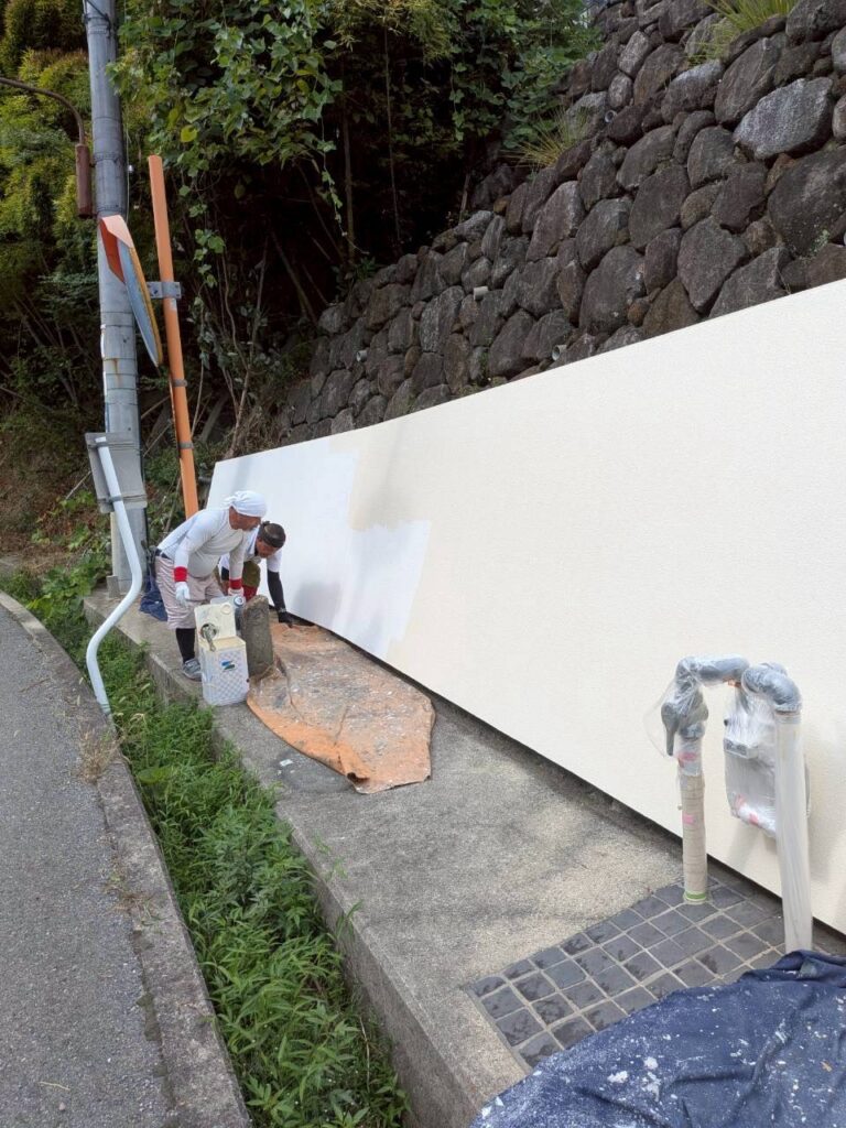 ビフォーアフターの写真ではありませんが、こちらは擁壁塗装している際の作業風景写真となります✨